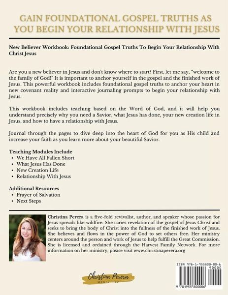 New Believer Workbook: Foundational Gospel Truths To Begin Your Relationship With Christ Jesus Are you a new believer in Jesus and don't know where to start? First, let me say, "welcome to the family of God!" It is important to anchor yourself in the gospel and the finished work of Jesus. This powerful workbook includes foundational gospel truths to anchor your heart in new covenant reality and interactive journaling prompts to begin your relationship with Jesus. This workbook includes teaching based on the Word of God, and it will help you understand precisely why you need a Savior, what Jesus has done, your new creation life in Jesus, and how to have a relationship with Jesus. Journal through the pages to dive deep into the heart of God for you as His child and increase your faith as you learn more about your beautiful Savior. Teaching Modules IncludeWe Have All Fallen Short What Jesus Has Done New Creation Life Relationship With Jesus ResourcesPrayer of Salvation Next Steps