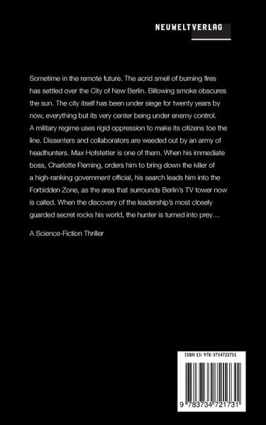"Dystopian." "Captivating." "Stunning."Sometime in the remote future. The acrid smell of burning fires has settled over the City of New Berlin. Billowing smoke obscures the sun. The city itself has been under siege for twenty years by now, everything but its very center being under enemy control. A military regime uses rigid oppression to make its citizens toe the line. Dissenters and collaborators are weeded out by an army of headhunters. Max Hofstetter is one of them. When his immediate boss, Charlotte Fleming, orders him to bring down the killer of a high-ranking government official, his search leads him into the Forbidden Zone, as the area that surrounds Berlin's TV tower now is called. When the discovery of the leadership's most closely guarded secret rocks his world, the hunter is turned into prey...A Science-Fiction Thriller