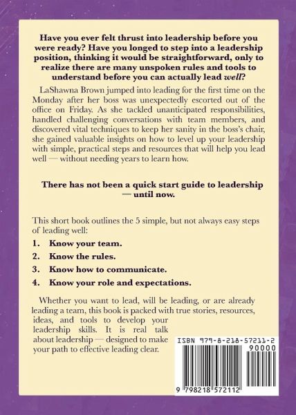 Have you ever felt thrust into leadership before you were ready? Have you longed to step into a leadership position, thinking it would be straightforward, only to realize there are many unspoken rules and tools to understand before you can actually lead well? LaShawna Brown jumped into leading for the first time on the Monday after her boss was unexpectedly escorted out of the office on Friday. As she tackled unanticipated responsibilities, handled challenging conversations with team members, and discovered vital techniques to keep her sanity in the boss's chair, she gained valuable insights on how to level up your leadership with simple, practical steps and resources that will help you lead well - without needing years to learn how. There has not been a quick start guide to leadership - until now. This short book outlines the 5 simple, but not always easy steps of leading well: 1. Know your team. 2. Know the rules. 3. Know how to communicate. 4. Know your role and expectations. 5. Execute with confidence and precision. Whether you want to lead, will be leading, or are already leading a team, this book is packed with true stories, resources, ideas, and tools to develop your leadership skills. It is real talk about leadership - designed to make your path to effective leading clear.