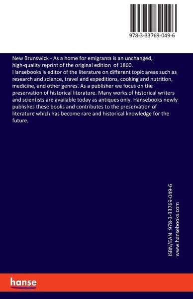 New Brunswick - As a home for emigrants is an unchanged, high-quality reprint of the original edition of 1860.Hansebooks is editor of the literature on different topic areas such as research and science, travel and expeditions, cooking and nutrition, medicine, and other genres. As a publisher we focus on the preservation of historical literature. Many works of historical writers and scientists are available today as antiques only. Hansebooks newly publishes these books and contributes to the preservation of literature which has become rare and historical knowledge for the future.