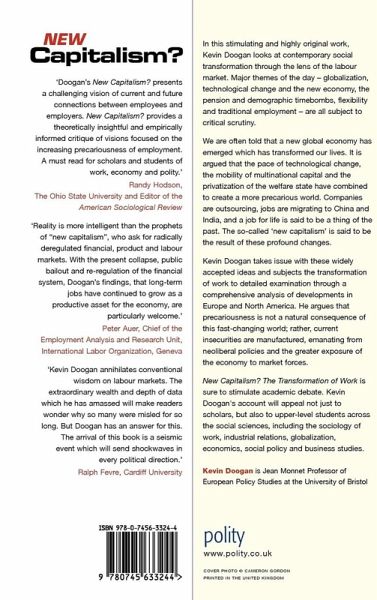 In this stimulating and highly original work, Kevin Doogan looks at contemporary social transformation through the lens of the labour market. Major themes of the day -- globalization, technological change and the new economy, the pension and demographic timebombs, flexibility and traditional employment -- are all subject to critical scrutiny. We are often told that a new global economy has emerged which has transformed our lives. It is argued that the pace of technological change, the mobility of multinational capital and the privatization of the welfare state have combined to create a more precarious world. Companies are outsourcing, jobs are migrating to China and India, and a job for life is said to be a thing of the past. The so-called 'new capitalism' is said to be the result of these profound changes. Kevin Doogan takes issue with these widely-accepted ideas and subjects the transformation of work to detailed examination through a comprehensive analysis of developments in Europe and North America. He argues that precariousness is not a natural consequence of this fast-changing world; rather, current insecurities are manufactured, emanating from neoliberal policy and the greater exposure of the economy to market forces. New Capitalism? The Transformation of Work is sure to stimulate academic debate. Kevin Doogan's account will appeal not just to scholars, but also to upper-level students across the social sciences, including the sociology of work, industrial relations, globalization, economics, social policy and business studies.