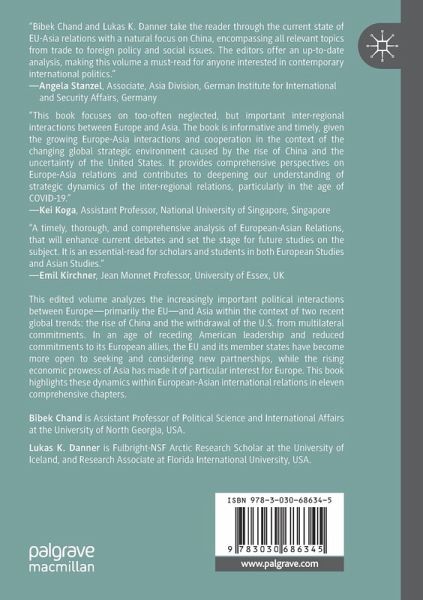Part I: The Rise of European-Asian Relations.- Chapter 1: Introduction.- Part II: Europe & East Asia.- Chapter 2: The EU as Pivotal Player in the Growing China-US Conflict.- Chapter 3: Making Sense of the EU-China Relations: Partners and Rivals.- Chapter 4: Korean, Japanese, and Chinese Free Trade Agreements with European States in an Age of U.S. Protectionism.- Part III: Europe & Southeast Asia.- Chapter 5: The ASEAN-EU Relations and the ASEAN Regional Integration.- Chapter 6: An Analysis of EU Free Trade Agreements and Negotiations with Southeast Asian Countries.- Chapter 7: EU-Southeast Asian Relations: What Lies Ahead?.- Part IV: Europe & South and Central Asia.- Chapter 8: EU-India Relations and New Political Realities: Normative Convergence and its Implications for Shared Strategic Concerns.- Chapter 9: The European Union's Impact in South Asia: Norms or Geopolitics?.- Chapter 10: The COVID-19 Pandemic: Crisis and Opportunity for a Different Approach to EU-Afghanistan Migration Management.- Part V: The Future of European-Asian Relations.- Chapter 11: Conclusion.