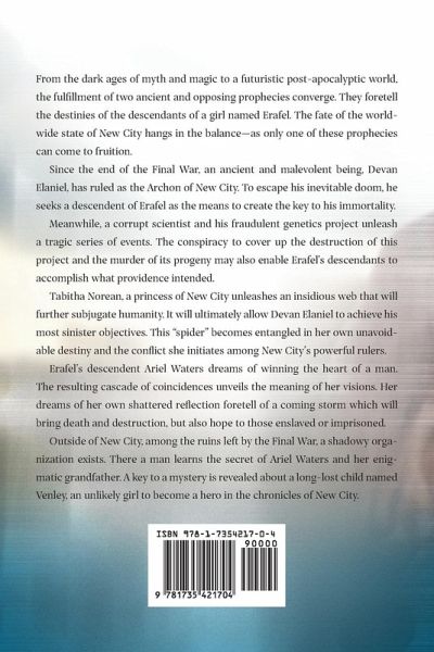 From the dark ages of myth and magic to a futuristic post-apocalyptic world, the fulfillment of two ancient and opposing prophecies converge. They foretell the destinies of the descendants of a girl named Erafel. The fate of the worldwide state of New City hangs in the balance-as only one of these prophecies can come to fruition. Since the end of the Final War, an ancient and malevolent being, Devan Elaniel, has ruled as the Archon of New City. To escape his inevitable doom, he seeks a descendent of Erafel as the means to create the key to his immortality. Meanwhile, a corrupt scientist and his fraudulent genetics project unleash a tragic series of events. The conspiracy to cover up the destruction of this project and the murder of its progeny may also enable Erafel's descendants to accomplish what providence intended. Tabitha Norean, a princess of New City unleashes an insidious web that will further subjugate humanity. It will ultimately allow Devan Elaniel to achieve his most sinister objectives. This "spider" becomes entangled in her own unavoidable destiny and the conflict she initiates among New City's powerful rulers. Erafel's descendent Ariel Waters dreams of winning the heart of a man. The resulting cascade of coincidences unveils the meaning of her visions. Her dreams of her own shattered reflection foretell of a coming storm which will bring death and destruction, but also hope to those enslaved or imprisoned. Outside of New City, among the ruins left by the Final War, a shadowy organization exists. There a man learns the secret of Ariel Waters and her enigmatic grandfather. A key to a mystery is revealed about a long-lost child named Venley, an unlikely girl to become a hero in the chronicles of New City.