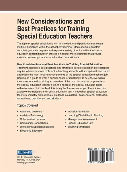 The topic of special education is rich in knowledge and pedagogy that covers multiple disciplines within the school environment. Many special educators complete graduate degrees and explore a variety of topics within the special education context; however, there is a need for more resources that provide essential knowledge to special education professionals. New Considerations and Best Practices for Training Special Education Teachers discusses best practices and strategies special education professionals require to become more proficient in teaching students with exceptional needs and addresses the most important components of the special education teacher's job. Serving as a guide of what a special educator must know to be effective within the classroom and providing an overview of the most important components of the special education teacher's job, the needs of the special educator, along with new research in the field, this timely book covers a range of topics such as assistive technologies and special education law. It is ideal for special education teachers, industry professionals, guidance counselors, academicians, professors, researchers, practitioners, and students.