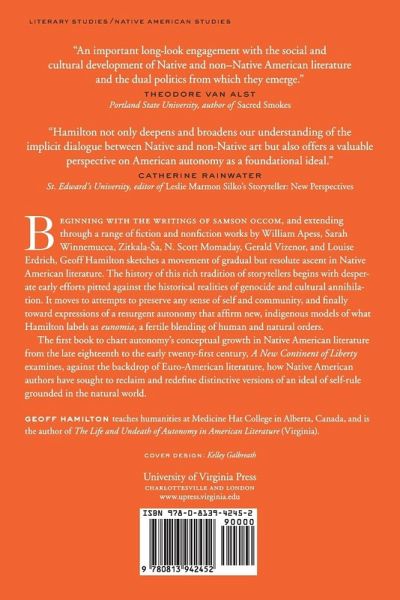 The first book to chart autonomy's conceptual growth in Native American literature from the late eighteenth to the early twenty-first century, A New Continent of Liberty examines, against the backdrop of Euro-American literature, how Native American authors have sought to reclaim and redefine distinctive versions of an ideal of self-rule grounded in the natural world. Beginning with the writings of Samson Occom, and extending through a range of fiction and nonfiction works by William Apess, Sarah Winnemucca, Zitkala-Sa, N. Scott Momaday, Gerald Vizenor, and Louise Erdrich, Geoff Hamilton sketches a movement of gradual but resolute ascent: from often desperate early efforts, pitted against the historical realities of genocide and cultural annihilation, to preserve any sense of self and community, toward expressions of a resurgent autonomy that affirm new, iIndigenous models of eunomia, a fertile blending of human and natural orders.