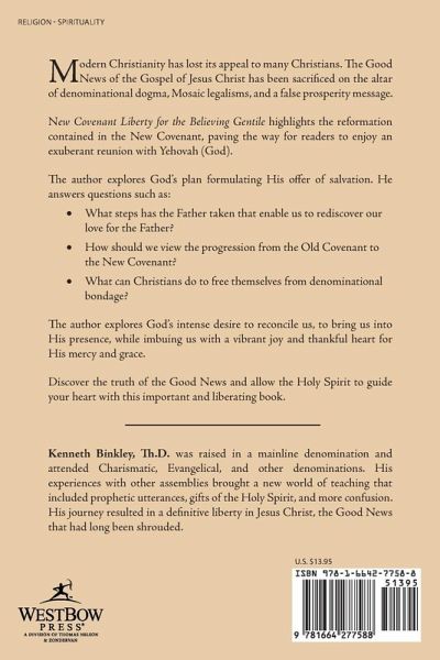 Modern Christianity has lost its appeal to many Christians. The Good News of the Gospel of Jesus Christ has been sacrificed on the altar of denominational dogma, Mosaic legalisms, and a false prosperity message. New Covenant Liberty for the Believing Gentile highlights the reformation contained in the New Covenant, paving the way for readers to enjoy an exuberant reunion with Yehovah (God). The author explores God's plan formulating His offer of salvation. He answers questions such as: What steps has the Father taken that enable us to rediscover our love for the Father? How should we view the progression from the Old Covenant to the New Covenant? What can Christians do to free themselves from denominational bondage? The author explores God's intense desire to reconcile us, to bring us into His presence, while imbuing us with a vibrant joy and thankful heart for His mercy and grace. Discover the truth of the Good News and allow the Holy Spirit to guide your heart with this important and liberating book.