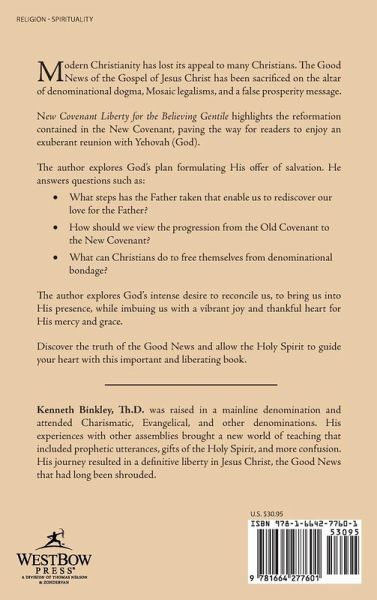 Modern Christianity has lost its appeal to many Christians. The Good News of the Gospel of Jesus Christ has been sacrificed on the altar of denominational dogma, Mosaic legalisms, and a false prosperity message. New Covenant Liberty for the Believing Gentile highlights the reformation contained in the New Covenant, paving the way for readers to enjoy an exuberant reunion with Yehovah (God). The author explores God's plan formulating His offer of salvation. He answers questions such as: What steps has the Father taken that enable us to rediscover our love for the Father? How should we view the progression from the Old Covenant to the New Covenant? What can Christians do to free themselves from denominational bondage? The author explores God's intense desire to reconcile us, to bring us into His presence, while imbuing us with a vibrant joy and thankful heart for His mercy and grace. Discover the truth of the Good News and allow the Holy Spirit to guide your heart with this important and liberating book.