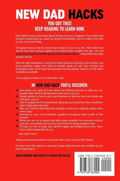 Did your Partner just hit you with that big "P-word" and now you're suddenly realizing you have no idea what you're supposed to do about it? ¿ Are you excited and terrified at the same time and really thought you'd be more prepared for this than you currently feel? Maybe it's a bit unexpected, or maybe you've been trying for a while now, but all of a sudden it's true - you're going to be a father! No matter how you are currently feeling, one thing is for sure - your life is about to change forever. But this doesn't have to be overwhelming or derailing. You don't have to struggle through these next months and wind up learning all the lessons the hard way. Actually, you can do the exact opposite! This is normal, and it's totally okay to feel like you're not prepared. However, it is up to you to ensure that before the time comes, you are indeed prepared. The good news is that it's never been easier for you to do this. With dads from around the world coming together and sharing their insights and tips, you can easily learn nearly everything you'll ever need to know - long before any baby actually arrives. With the right awareness, a month-by-month guide to empower your choices, and some powerful insight into what is actually going on with your woman and developing child, you'll soon find yourself knowing exactly what to do with these inevitable curveballs. You're going to knock it out of the park, man! In The Dad Hacks, you'll discover: ¿ Everything you need to know about the birthing process so that you can actually help with the tuff decisions when they come up ¿ Expert advice on how to plan your finances so that you and your family are well taken care of ¿ How to prepare for the unexpected, allowing you to look like a true superhero when things get a bit nasty ¿ Why you need to start doing the cooking (or else you might be eating some weird crap) ¿ Answers to your most important questions throughout each month of the process ¿ What you can do to ensure that labor goes smoothly for everyone involved and why your wife will love you even more for being prepared here ¿ Pro-tips on how to keep your partner happy and feeling loved even when she's yelling obscenities at you ... and much more! Look dude, this is a big deal - you're right. But you can handle it. You can master this and develop the skills you'll need to be there for your family. Setting a positive example for your kids starts now, and you ARE ready! It's time to put the worries to rest and to step boldly into the role of father you've been dreaming of. If you're ready to show everyone how great of a father you can be, then scroll up and click the "Add to Cart" button right now.