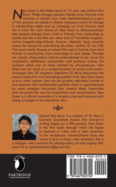 New Dawn is the debut novel of 15 year old,Indrani Das Bora. Things change: people, friends, love, life and even enemies, or should I say rivals. Metamorphosis is a part of this universe we reside in. Mostly because a pinch of change in relationships might end up changing our lives forever. And this is what the main theme of New Dawn is: Metamorphosis; that people change; from rivals to friends; from underdogs to bullies. But this is not like any other tale of friendship-tragedy-enmity-tragedy-help-friends forever. Nobody here actually knows the reason for one hating the other: neither I.D. nor N.B. (who are the protagonists). The novel mostly focuses on school life and its fancies, from bad friends to boyfriends, from underdogs to cool dudes. Through her minute observations Indrani embroidered in her novel the complexity, selfishness, competition and jealousy etc among the students which are at times indirectly insisted by circumstances. . New Dawn can be cited as a conglomeration of prose and poetry. Arranged into 20 chapters, debutant I.D. Bora show cases the unseen scene of a rival counselling another rival.New Dawn takes us to a roller coaster ride into the private, individual worlds two students of multifaceted qualities which is superimposed by some complex character that reveals deep insecurities and yet pave the way for forgiveness and reconciliation. New Dawn is a vibrant example of a simple, crisp and humorous plot being arranged in an innovative way.