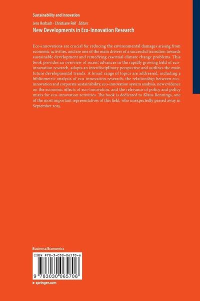 New Developments in Eco-Innovation Research: Aim of the Book and Overview of the Different Chapters.- Changing Patterns in Eco-Innovation Research: A Bibliometric Analysis.- On the Economic Returns of Eco-Innovation: Where Do We Stand?.- Shaping System Innovation: Transformative Environmental Policies.- Outlook: Can Environmental Product Standards Enable Eco-Innovation?.- Disentanglin Technological Innovations: A Micro-econometric Analysis of Their Determinants.- The Impact of Resource Efficiency Measures on Performance in Small and Medium-sized Enterprises.- Good Enough. Are Socially Responsible Companies the More Successful Environmental Innovators?.- Environmental Innovation and Corporate Sustainability: A 15-year Comparison Based on Survey Data.- Effects of Innovation and Domestic Market Factors on OECD Countries' Exports of Wind Power Technologies.- Exploring the Role of Instrument Design and Instrument Interaction for Eco-Innovation: A Survey-based Analysis of Renewable Energy Innovation in Germany.- Corporate Social Responsibility in the Fashion Industry - How Eco-Innovations Can Lead to a (More) Sustainable Business Model in the Fashion Industry.- Towards a Dynamic Understanding of Innovation Systems: An Integrated TIS-MLP Approach for Wind Turbines.