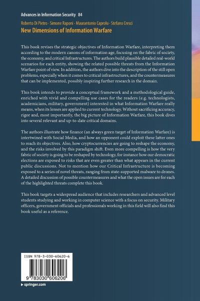 The authors illustrate how finance (an always green target of Information Warfare) is intertwined with Social Media, and how an opponent could exploit these latter ones to reach its objectives. Also, how cryptocurrencies are going to reshape the economy, and the risks involved by this paradigm shift. Even more compelling is how the very fabric of society is going to be reshaped by technology, for instance how our democratic elections are exposed to risks that are even greater than what appears in the current public discussions. Not to mention how our Critical Infrastructure is becoming exposed to a series of novel threats, ranging from state-supported malware to drones. A detailed discussion of possible countermeasures and what the open issues are for each of the highlighted threats complete this book.