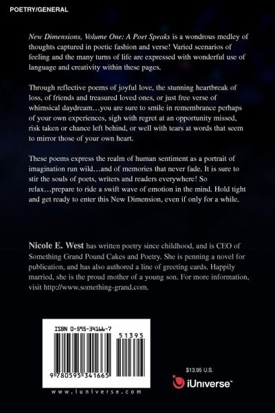 New Dimensions, Volume One: A Poet Speaks is a wondrous medley of thoughts captured in poetic fashion and verse! Varied scenarios of feeling and the many turns of life are expressed with wonderful use of language and creativity within these pages. Through reflective poems of joyful love, the stunning heartbreak of loss, of friends and treasured loved ones, or just free verse of whimsical daydream...you are sure to smile in remembrance perhaps of your own experiences, sigh with regret at an opportunity missed, risk taken or chance left behind, or well with tears at words that seem to mirror those of your own heart. These poems express the realm of human sentiment as a portrait of imagination run wild...and of memories that never fade. It is sure to stir the souls of poets, writers and readers everywhere! So relax...prepare to ride a swift wave of emotion in the mind. Hold tight and get ready to enter this New Dimension, even if only for a while.