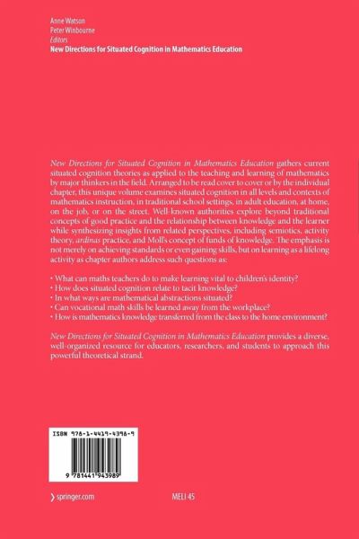 New Directions for Situated Cognition in Mathematics Education represents the maturation and expansion of the situated cognition theories applied to mathematics education. All of the situations on which the chapters of this book are based exemplify activity which would be described as mathematical, whether they are classrooms, workplaces, homes or the street. In identifying mathematical activity, this book examines the ways people talk, what they talk about, what they focus on, how they classify experience, what levels and kinds of generality occur to them, what is varied and what is fixed, what relationships they observe or construct and how they express them-much they way music, musicality, and a musician are recognized.