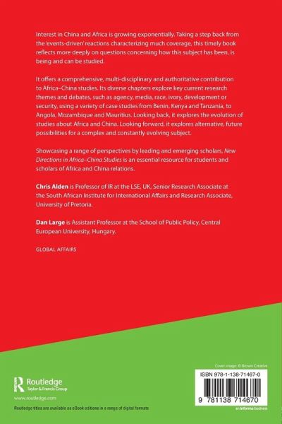 Interest in China and Africa is growing exponentially. Taking a step back from the¿'events-driven' reactions characterizing much coverage, this timely book reflects more deeply on questions concerning how this subject has been, is being and can be¿studied. It offers a comprehensive, multi-disciplinary and authoritative contribution to Africa-China studies. Its diverse chapters explore key current research themes and debates, such as agency, media, race, ivory, development or security, using a variety of case studies from Benin, Kenya and Tanzania, to Angola, Mozambique and Mauritius. Looking back, it explores the evolution of studies about Africa and China. Looking forward, it explores alternative, future possibilities for a complex and constantly evolving subject. Showcasing a range of perspectives by leading and ¿emerging scholars, New Directions in Africa-China Studies is an essential resource ¿for students and scholars of Africa and China relations.