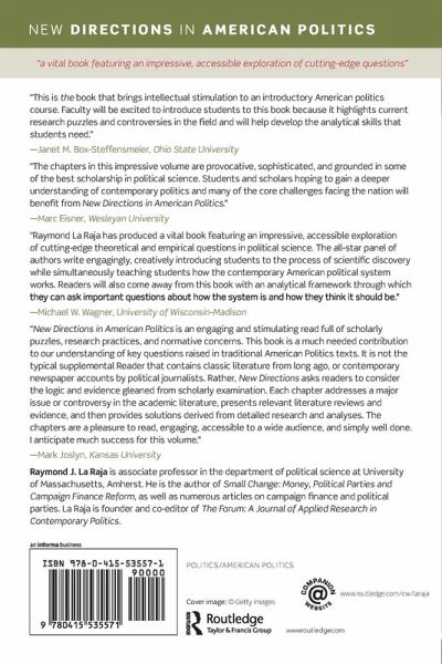 New Directions in American Politics introduces students not just to how the American political system works but also to how political science works. La Raja brings together top scholars to write original essays across the standard curriculum of American government and politics, capturing emerging research in the discipline in a way that is accessible for undergraduates. Each chapter combines substantive knowledge with the kind of skill-building and analytical inquiry that is being touted in higher education everywhere. Contributors to New Directions highlight why the questions they seek to answer are critical for understanding American politics, and situate them in the broader context of controversies in research. The teaching of American politics follows a well-worn path. Textbooks for introductory courses hew to a traditional set of chapters that describe the Founding, American institutions, the ways citizens participate in politics, and sometimes public policy. The material rarely engages students in the kind of questions that animate scholarship on politics. One hurdle for instructors is finding material that reflects quality scholarship-and thus teaches students about why, not just what-and yet is accessible for undergraduates. Articles in scholarly journals are typically unsuited for undergraduate courses, particularly introductory courses. What is needed is a book that conveys exciting trends in scholarship across vital topics in American politics and illustrates analytical thinking. New Directions in American Politics is that book and will be an ideal companion to standard textbooks that focus mostly on nuts and bolts of politics. The book features: Contributions from a top-notch cast of active scholars and a highly regarded editor A focus on analytical thinking that addresses questions of causality Full coverage of the American politics curriculum Short interviews with each contributor on a companion website to help the research come alive and prompt critical thinking questions for students Work that draws on the highest quality research in political science but is written specifically for first year undergraduate students. There is simply no book like this available to the growing number of faculty who want their introductory American politics course to be a reflection of the political science discipline and not just the nuts and bolt facts of the American political system.
