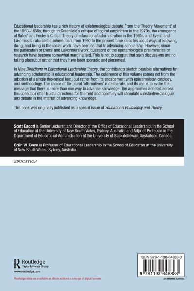 New Directions in Educational Leadership Theory sketches possible alternatives for advancing scholarship in educational leadership. Engaging epistemology, ontology, and methodology, the volume evokes the message that there is more than one way to advance knowledge. The approaches adopted across this collection offer fruitful directions for the field and hopefully will stimulate substantive dialogue and debate in the interest of advancing knowledge. This book was originally published as a special issue of Educational Philosophy and Theory.