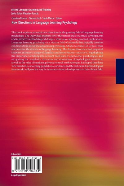 This book explores potential new directions in the growing field of language learning psychology. The individual chapters cover theoretical and conceptual developments and innovative methodological designs, while also exploring practical implications. Language learning psychology is a vibrant field of research that typically involves constructs from social and educational psychology, which it considers in terms of their relevance for the domain of language learning. The diverse theoretical and empirical chapters examine a range of familiar and lesser-known constructs, highlighting the importance of taking into account both learner and teacher psychologies, and recognising the complexity, dynamism and situatedness of psychological constructs, as well as the value of employing diverse research methodologies. It is hoped that these 'new directions' concerning populations, constructs and theoretical and methodological frameworks will pave the way for innovative future developments in this vibrant field.