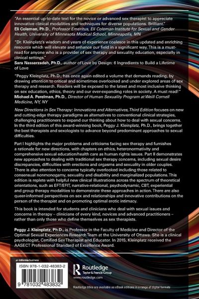'Peggy Kleinplatz has curated guidance from the leading voices in 21st century sexology to create a resource that is as impressive in scope as it is in sensitivity. New Directions in Sex Therapy lays the foundation for ethical, inclusive, and affirming sexual health practice. This book belongs on the desk of every mental and medical health provider who cares about the holistic well-being of those they serve.'