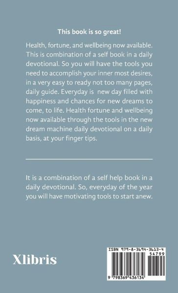 This book is so great! Health, fortune, and wellbeing now available. This is combination of a self book in a daily devotional. So you will have the tools you need to accomplish your inner most desires, in a very easy to ready not too many pages, daily guide. Everyday is new day filled with happiness and chances for new dreams to come, to life. Health fortune and wellbeing now available through the tools in the new dream machine daily devotional on a daily basis, at your finger tips.