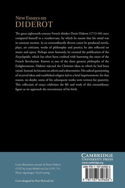 The great eighteenth-century French thinker Denis Diderot (1713-84) once compared himself to a weathervane, by which he meant that his mind was in constant motion. In an extraordinarily diverse career he produced novels, plays, art criticism, works of philosophy and poetics, and also reflected on music and opera. Perhaps most famously, he ensured the publication of the Encyclopédie, which has often been credited with hastening the onset of the French Revolution. Known as one of the three greatest philosophes of the Enlightenment, Diderot rejected the Christian ideas in which he had been raised. Instead, he became an atheist and a determinist. His radical questioning of received ideas and established religion led to a brief imprisonment, and for that reason, no doubt, some of his subsequent works were written for posterity. This collection of essays celebrates the life and work of this extraordinary figure as we approach the tercentenary of his birth.