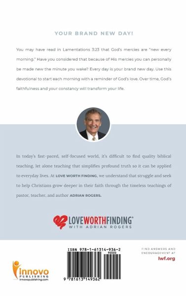 -ABOUT THE BOOK: You may have read in Lamentations 3:23 that God's mercies are "new every morning." Have you considered that because of His mercies you can personally be made new the minute you wake? Every day is your brand new day. Use this devotional to start each morning with a reminder of God's love. Over time, God's faithfulness and your constancy will transform your life. ¿¿¿¿¿¿¿¿-ABOUT THE AUTHOR: In today's fast-paced, self-focused world, it's difficult to find quality biblical teaching, let alone teaching that simplifies profound truth so it can be applied to everyday lives. At LOVE WORTH FINDING, we understand that struggle and seek to help Christians grow deeper in their faith through the timeless teachings of pastor, teacher, and author ADRIAN ROGERS. ¿¿¿¿¿¿¿¿¿¿¿¿¿-ABOUT THE PUBLISHER: ¿Innovo Publishing LLC a multimedia publisher located near Memphis, TN. Since 2008, Innovo has published quality books, eBooks, audiobooks, music, screenplays, and curricula for authors, artists, and organizations within Christian and wholesome markets. Innovo's capabilities and global reach provide authors, artists and ministries access to the world for Christ. To learn more about Innovo Publishing, visit our website at innovopublishing.com. To connect with other Christian creatives and to learn best practices for creating, publishing, marketing, and selling Christian titles, visit the Christian Publishing Portal at cpportal.com.
