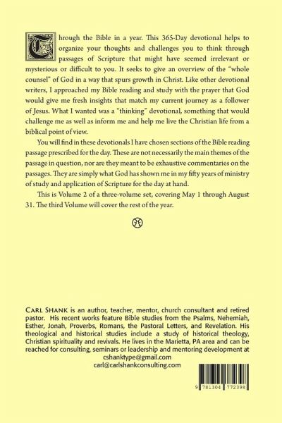 This 365-Day devotional helps to organize your thoughts and challenges you to think through passages of Scripture that might have seemed irrelevant or mysterious or difficult to you. It seeks to give an overview of the "whole counsel" of God in a way that spurs growth in Christ. This is Volume 2 of a three-volume set, covering May 1 through August 31. The third Volume will cover the rest of the year.