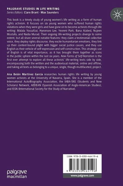 This book is a timely study of young women's life writing as a form of human rights activism. It focuses on six young women who suffered human rights violations when they were girls and have gone on to become activists through life writing: Malala Yousafzai, Hyeonseo Lee, Yeonmi Park, Bana Alabed, Nujeen Mustafa, and Nadia Murad. Their ongoing life-writing projects diverge to some extent, but all share several notable features: they claim a testimonial collective voice, they deploy rights discourse, they excite humanitarian emotions, they link up their context-bound plight with bigger social justice causes, and they use English as their vehicle of self-expression and self-construction. This strategic use of English is of vital importance, as it has brought them together as icons in the public sphere within the last six years. New Forms of Self-Narration is the first ever attempt to explore all these activists' life-writing texts side by side, encompassing both the written andthe audiovisual material, online and offline, and taking all texts as belonging to a unique, single, though multifaceted, project.