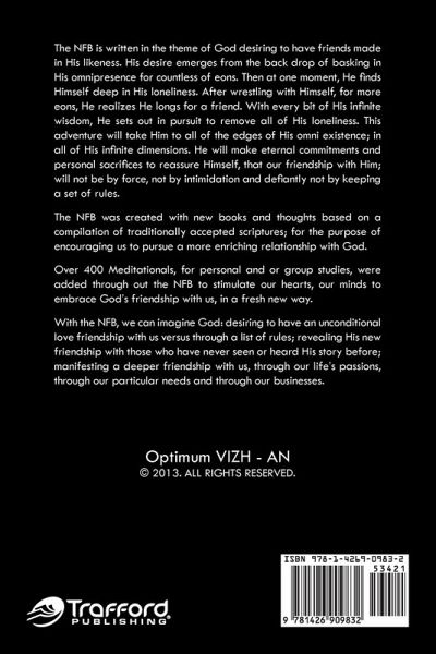 The NFB is written in the theme of God desiring to have friends made in His likeness. His desire emerges from the back drop of basking in His omnipresence for countless of eons. Then at one moment, He finds Himself deep in His loneliness. After wrestling with Himself, for more eons, He realizes He longs for a friend. With every bit of His infinite wisdom, He sets out in pursuit to remove all of His loneliness. This adventure will take Him to all of the edges of His omni existence; in all of His infinite dimensions. He will make eternal commitments and personal sacrifices to reassure Himself, that our friendship with Him; will not be by force, not by intimidation and defiantly not by keeping a set of rules. The NFB was created with new books and thoughts based on a compilation of traditionally accepted scriptures; for the purpose of encouraging us to pursue a more enriching relationship with God. Over 400 Meditationals, for personal and or group studies, were added through out the NFB to stimulate our hearts, our minds to embrace God's friendship with us, in a fresh new way. With the NFB, we can imagine God: desiring to have an unconditional love friendship with us versus through a list of rules; revealing His new friendship with those who have never seen or heard His story before; and His manifesting a deeper friendship with us, through our life's passions, through our particular needs and through our businesses.