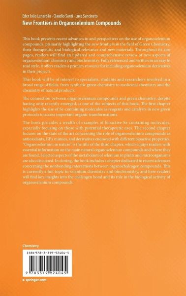 The book provides a wealth of examples of bioactive Se-containing molecules, especially focusing on those with potential therapeutic uses. The second chapter focuses on the state of the art concerning the role of organoselenium compounds as antioxidants, GPx mimics, and derivatives endowed with different bioactive properties. "Organoselenium in nature" is the title of the third chapter, which equips readers with essential information on the main natural organoselenium compounds and where they are found. Selected aspects of the metabolism of selenium in plants and microorganisms are also discussed. In closing, the book includes a chapter dedicated to recent advances concerning the nonbonding interactions between organochalcogen compounds. This is currently a hot topic in selenium chemistry and biochemistry, and here readers will find key insights into the chalcogen bond and its role in the biological activity of organoselenium compounds.