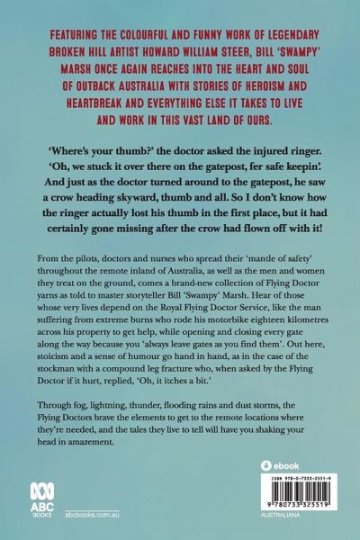 'Where's your thumb?' the doctor asked the injured ringer. 'Oh, we stuck it over there on the gatepost, fer safe keepin'.' And just as the doctor turned around to the gatepost, he saw a crow heading skyward, thumb and all. So I don't know how the ringer actually lost his thumb in the first place, but it had certainly gone missing after the crow had flown off with it. From the pilots, doctors and nurses who spread their 'mantle of safety' throughout the remote inland of Australia, as well as the men and women they treat on the ground, comes a brand-new collection of Flying Doctor yarns as told to master storyteller Bill 'Swampy' Marsh. Hear of those whose very lives depend on the Royal Flying Doctor Service, like the man suffering from extreme burns who rode his motorbike eighteen kilometres back across his property to get help while opening and closing every gate along the way because you 'always leave gates as you find them'. Out here, stoicism and a sense of humour go hand in hand, as in the case of the stockman with a compound leg fracture who, when asked by the Flying Doctor if it hurt, replied, 'Oh, it itches a bit.' through fog, lightning, thunder, flooding rains and dust storms, the Flying Doctor braves the elements to get to the remote outback landing strips where they're needed and the tales they live to tell will have you shaking your head in amazement. Featuring the colourful and funny work of legendary Broken Hill artist Howard William Steer, master storyteller Bill 'Swampy' Marsh once again reaches into the the heart and soul of outback Australia with stories of heroism and heartbreak and everything else it takes to live and work in this vast land of ours.