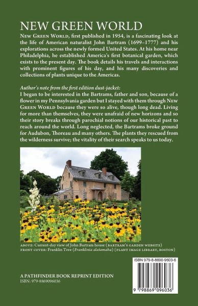 New Green World, first published in 1954, is a fascinating look at the life of American naturalist John Bartram (1699-1777) and his explorations across the newly formed United States. At his home near Philadelphia, he established America's first botanical garden, which exists to the present day. The book details his travels and interactions with prominent figures of his day, and his many discoveries and collections of plants unique to the Americas. Author's note from the first edition dust-jacket: I began to be interested in the Bartrams, father and son, because of a flower in my Pennsylvania garden but I stayed with them through New Green World because they were so alive, though long dead. Living for more than themselves, they were unafraid of new horizons and so their story breaks through parochial notions of our historical past to reach around the world. Long neglected, the Bartrams broke ground for Audubon, Thoreau and many others. The plants they rescued from the wilderness survive; the vitality of their search speaks to us today.