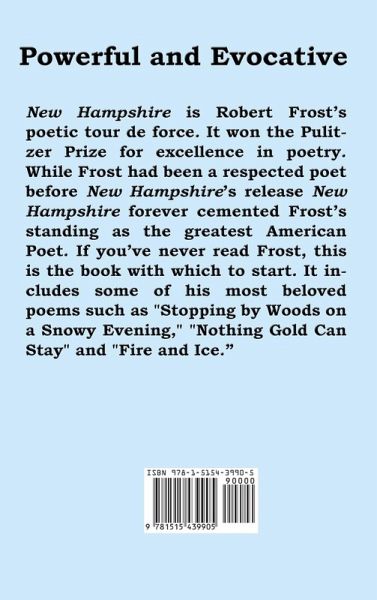 New Hampshire is Robert Frost’s poetic tour de force. It won the Pulitzer Prize for excellence in poetry. While Frost had been a respected poet before New Hampshire’s release New Hampshire forever cemented Frost’s standing as the greatest American Poet. If you’ve never read Frost, this is the book with which to start. It includes some of his most beloved poems such as "Stopping by Woods on a Snowy Evening," "Nothing Gold Can Stay" and "Fire and Ice." Powerful and Evocative. Poems included are: New Hampshire A Star in a Stone-Boat The Census-Taker The Star-Splitter Maple The Ax-Helve The Grindstone Paul’s Wife Wild Grapes Place for a Third Two Witches - The Witch of Coos - The Pauper Witch of Grafton An Empty Threat A Fountain, a Bottle, a Donkey’s Ears, and Some Books I Will Sing You One-O Fragmentary Blue Fire and Ice In a Disused Graveyard Dust of Snow To E.T. Nothing Gold Can Stay The Runaway The Aim Was Song Stopping by Woods on a Snowy Evening For Once, Then, Something Blue-Butterfly Day The Onset To Earthward Good-by and Keep Cold Two Look at Two Not to Keep A Brook in the City The Kitchen Chimney Looking for a Sunset Bird in Winter A Boundless Moment Evening in a Sugar Orchard Gathering Leaves The Valley’s Singing Day Misgiving A Hillside Thaw Plowmen On a Tree Fallen Across the Road Our Singing Strength The Lockless Door The Need of Being Versed in Country Things