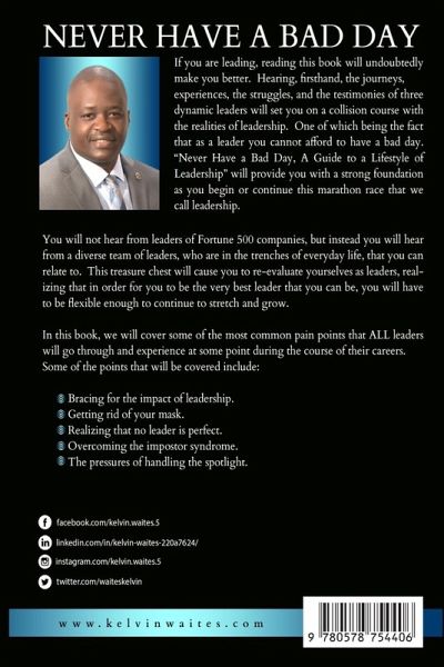 If you are leading, reading this book will undoubtedly make you better. Hearing firsthand the journeys, experiences, the struggles, and the testimonies of three dynamic leaders will set you on a collision course with the realities of leadership. One of which being the fact that as a leader you cannot afford to have a bad day. "Never Have a Bad Day, A Guide to a Lifestyle of Leadership" will provide you with a strong foundation as you begin or continue this marathon race that we call leadership. You will not hear from leaders of Fortune 500 companies, but instead you will hear from a diverse team of leaders, who are in the trenches of everyday life, that you can relate to. This treasure chest will cause you to re-evaluate yourselves as leaders, realizing that in order for you to be the very best leader that you can be, you will have to be flexible enough to continue to stretch and grow. This book covers some of the most common pain points that ALL leaders go through and experience at some point during the course of their careers. Pain points such as; ¿ Bracing for the impact of leadership ¿ Getting rid of your mask ¿ Realizing that no leader is perfect ¿ Overcoming the imposter syndrome ¿ The pressures of handling the spotlight