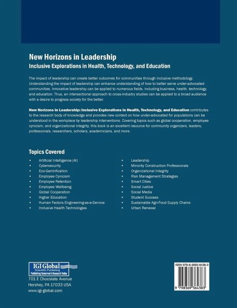 The impact of leadership can create better outcomes for communities through inclusive methodology. Understanding the impact of leadership can enhance understanding of how to better serve under-advocated communities. Innovative leadership can be applied to numerous fields, including business, health, technology, and education. Thus, an intersectional approach to cross-industry studies can be applied to a broad audience with a desire to progress society for the better. New Horizons in Leadership: Inclusive Explorations in Health, Technology, and Education contributes to the research body of knowledge and provides new context on how under-advocated for populations can be understood in the workplace by leadership interventions. Covering topics such as global cooperation, employee cynicism, and organizational integrity, this book is an excellent resource for community organizers, leaders, professionals, researchers, scholars, academicians, and more.