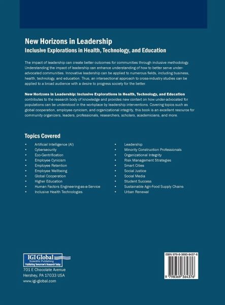 The impact of leadership can create better outcomes for communities through inclusive methodology. Understanding the impact of leadership can enhance understanding of how to better serve under-advocated communities. Innovative leadership can be applied to numerous fields, including business, health, technology, and education. Thus, an intersectional approach to cross-industry studies can be applied to a broad audience with a desire to progress society for the better. New Horizons in Leadership: Inclusive Explorations in Health, Technology, and Education contributes to the research body of knowledge and provides new context on how under-advocated for populations can be understood in the workplace by leadership interventions. Covering topics such as global cooperation, employee cynicism, and organizational integrity, this book is an excellent resource for community organizers, leaders, professionals, researchers, scholars, academicians, and more.
