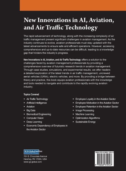 The rapid advancement of technology, along with the increasing complexity of air traffic management present significant challenges in aviation management. As the industry continues to evolve, aviation professionals must stay updated with the latest advancements to ensure safe and efficient operations. However, accessing comprehensive and up-to-date resources can be difficult, leading to a knowledge gap that hinders the industry's progress. New Innovations in AI, Aviation, and Air Traffic Technology offers a solution to the challenges faced by aviation management professionals by providing a comprehensive overview of futuristic research trends in aviation management. Through case studies, simulations, and experimental results, we offer readers a detailed exploration of the latest trends in air traffic management, uncrewed aerial vehicles (UAVs), electric vehicles, and more. By providing a bridge between theory and practice, this book equips aviation professionals with the knowledge and tools needed to navigate and contribute to the rapidly evolving aviation industry.