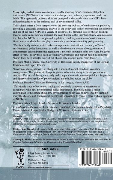 Introduction: "New" Instruments of Environmental Governance - Patterns and Pathways of Change Andrew Jordan et al. National Experiences: The Politics of "Light-Handed" Regulation - "New" Environmental Policy Instruments in Australia Elim Papadakis and Richard Grant. Struggling to Leave Behind a Highly Regulatory Past? "New" Environmental Policy Instruments in Austria Rudiger K.W. Wurzel et al. The Politics of Regulatory Reform - "New" Environmental Policy Instruments in Finland Rauno Sairinen. From High Regulatory State to Social and Ecological Market Economy? "New" Environmental Policy Instruments in Germany Rudiger K.W. Wurzel et al. Much Talk but Little Action? "New" Environmental Policy Instruments in Ireland Brendan Flynn. Instrument Innovation in an Environmental Lead State - "New" Environmental Policy Instruments in the Netherlands Anthony R. Zito et al. Policy Innovation or "Muddling Through"? "New" Environmental Policy Instruments in the United Kingdom Andrew Jordan et al. Comparative Conclusions: "New" Environmental Policy Instruments - An Evolution or a Revolution in Environmental Policy? Andrew Jordan et al.
