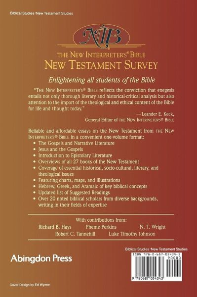 The Gospels and Narrative Literature - Robert C. Tannehill Jesus and the Gospels - Christopher M. Tuckett The Gospel of Matthew - M. Eugene Boring The Gospel of Mark - Pheme Perkins The Gospel of Luke - R. Alan Culpepper The Gospel of John - Gail R. O'Day The Acts of the Apostles - Robert W. Wall Introduction to Epistolary Literature - Robert W. Wall The Letter to the Romans - N. T. Wright The First Letter to the Corinthians - J. Paul Sampley The Second Letter to the Corinthians - J. Paul Sampley The Letter to the Galatians - Richard B. Hays The Letter to the Ephesians - Pheme Perkins The Letter to the Philippians - Morna D. Hooker The Letter to the Colossians - Andrew T. Lincoln The First Letter to the Thessalonians - Abraham Smith The Second Letter to the Thessalonians - Abraham Smith The First and Second Letter to Timothy and the Letter to Titus - James D. G. Dunn The Letter to Philemon - Cain Hope Felder The Letter to the Hebrews - Fred B. Craddock The Letter of James - Luke Timothy Johnson The First Letter of Peter - David L. Bartlett The Second Letter of Peter - Duane F. Watson The Letter of Jude - C. Clifton Black The First, Second, and Third Letters of John - Duane F. Watson The Book of Revelation - Christopher C. Rowland Features the latest in the line of New Interpreter's Products. An international array of the best biblical scholars writing in their fields of specialty of the benefits of students. A diversity of Protestant, Catholic, Women and Minority scholars providing sound biblical scholarship students of college, seminary and the church. Introduction to each book of the New Testament that cover essential historical, socio-cultural, literary and theological issues. Helpful maps, charts and outlines included.