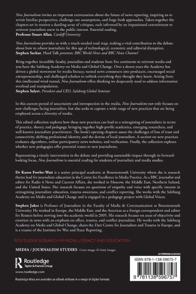 This edited collection explores how these new practices can lead to a reimagining of journalism in terms of practice, theory, and pedagogy, bringing together high-profile academics, emerging researchers, and well-known journalism practitioners. The book's opening chapters assess the challenges of loss of trust and connectivity, shifting professional identity, and the demise of local journalism. A section on new practices evaluates algorithms, online participatory news websites, and verification. Finally, the collection explores whether new pedagogies offer potential routes to new journalisms.