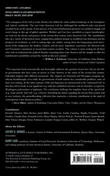 Chapter 1: Introduction: The Latin American Left in Theory and Practice Jeffery R. Webber and Barry Carr Part I: Theoretical Issues Chapter 2: Socialist Strategies in Latin America Claudio Katz Chapter 3: The Latin American Left in the Face of the New Imperialism Henry Veltmeyer Chapter 4: Neoliberal Class Formation(s): The Informal Proletariat and "New" Workers' Organizations in Latin America Susan Spronk Chapter 5: Revolution in Times of Neoliberal Hegemony: The Political Strategy of the MST in Brazil and the EZLN in Mexico Leandro Vergara-Camus Chapter 6:Barrio Women and Popular Politics in Chávez's Venezuela Sujatha Fernandes Part II: Case Studies of the New Latin American Left Chapter 7: From Left-Indigenous Insurrection to Reconstituted Neoliberalism in Bolivia: Political Economy, Indigenous Liberation, and Class Struggle, 2000-2011 Jeffery R. Webber Chapter 8:Venezuela: An Electoral Road to Twenty-First-Century Socialism? Gregory Wilpert Chapter 9:Ecuador: Indigenous Struggles and the Ambiguities of Electoral Power Marc Becker Chapter 10:Crisis and Recomposition in Argentina Emilia Castorina Chapter 11: Trade Unions, Social Conflict, and the Political Left in Present-Day Brazil: Between Breach and Compromise Ricardo Antunes Chapter 12: Neoliberal Authoritarianism, the "Democratic Transition," and the Mexican Left Richard Roman and Edur Velasco Arregui Chapter 13:The Chilean Left after 1990: An Izquierda Permitida Championing Transnational Capital, A Historical Left Ensnared in the Past, and a New Radical Left in Gestation Fernando Leiva Chapter 14:From Guerrillas to Government: The Continued Relevance of the Central American Left Héctor Perla Jr., Marco Mojica, and Jared Bibler Chapter 15: The Overthrow of a Moderate and the Birth of a Radicalizing Resistance: The Coup against Manuel Zelaya and the History of Imperialism and Popular Struggle in Honduras Todd Gordon and Jeffery R. Webber