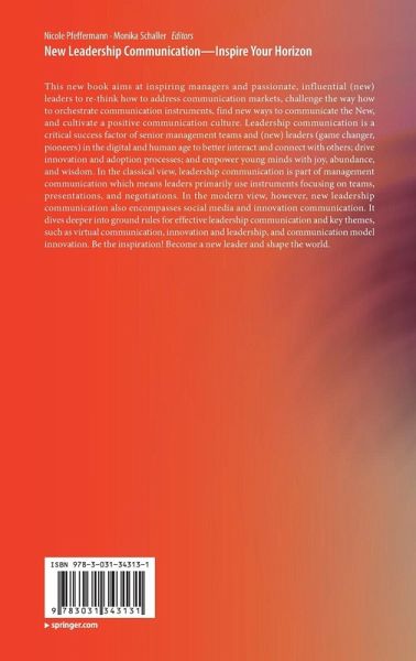 This new book aims at inspiring managers and passionate, influential (new) leaders to re-think how to address communication markets, challenge the way how to orchestrate communication instruments, find new ways to communicate the New, and cultivate a positive communication culture. Leadership communication is a critical success factor of senior management teams and (new) leaders (game changer, pioneers) in the digital and human age to better interact and connect with others; drive innovation and adoption processes; and empower young minds with joy, abundance, and wisdom. In the classical view, leadership communication is part of management communication which means leaders primarily use instruments focusing on teams, presentations, and negotiations. In the modern view, however, new leadership communication also encompasses social media and innovation communication. It dives deeper into ground rules for effective leadership communication and key themes, such as virtual communication,innovation and leadership, and communication model innovation. Be the inspiration! Become a new leader and shape the world.