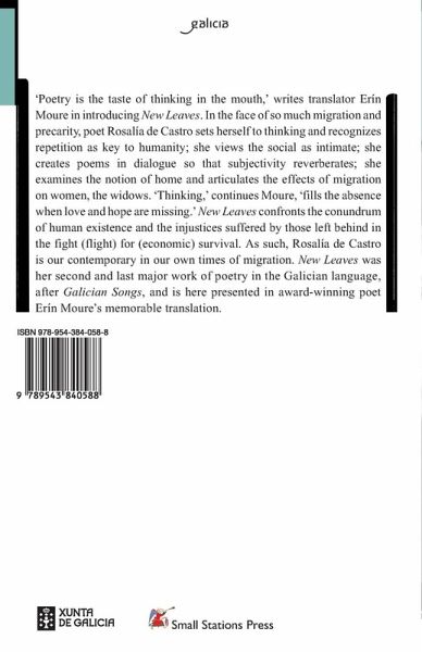 ‘Poetry is the taste of thinking in the mouth,’ writes translator Erín Moure in introducing New Leaves. In the face of so much migration and precarity, poet Rosalía de Castro sets herself to thinking and recognizes repetition as key to humanity; she views the social as intimate; she creates poems in dialogue so that subjectivity reverberates; she examines the notion of home and articulates the effects of migration on women, the widows. ‘Thinking,’ continues Moure, ‘fills the absence when love and hope are missing.’ New Leaves confronts the conundrum of human existence and the injustices suffered by those left behind in the fight (flight) for (economic) survival. As such, Rosalía de Castro is our contemporary in our own times of migration. New Leaves was her second and last major work of poetry in the Galician language, after Galician Songs, and is here presented in award-winning poet Erín Moure’s memorable translation.