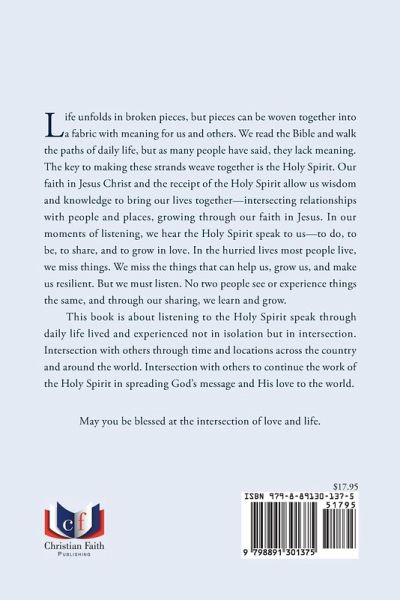 Life unfolds in broken pieces, but pieces can be woven together into a fabric with meaning for us and others. We read the Bible and walk the paths of daily life, but as many people have said, they lack meaning. The key to making these strands weave together is the Holy Spirit. Our faith in Jesus Christ and the receipt of the Holy Spirit allow us wisdom and knowledge to bring our lives together--intersecting relationships with people and places, growing through our faith in Jesus. In our moments of listening, we hear the Holy Spirit speak to us--to do, to be, to share, and to grow in love. In the hurried lives most people live, we miss things. We miss the things that can help us, grow us, and make us resilient. But we must listen. No two people see or experience things the same, and through our sharing, we learn and grow. This book is about listening to the Holy Spirit speak through daily life lived and experienced not in isolation but in intersection. Intersection with others through time and locations across the country and around the world. Intersection with others to continue the work of the Holy Spirit in spreading God's message and His love to the world. May you be blessed at the intersection of love and life.