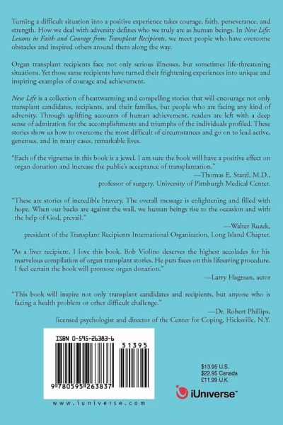 Turning a difficult situation into a positive experience takes courage, faith, perseverance, and strength. How we deal with adversity defines who we truly are as human beings. In New Life: Lessons in Faith and Courage, we meet people who have overcome obstacles and inspired others around them along the way. Organ transplant recipients face not only serious illnesses, but sometimes life-threatening situations. Yet those same recipients have turned their frightening experiences into unique and inspiring examples of courage and achievement. New Life is a collection of heartwarming and compelling stories that will encourage not only transplant candidates, recipients, and their families, but people who are facing any kind of adversity. Through uplifting accounts of human achievement, readers are left with a deep sense of admiration for the accomplishments and triumphs of the individuals profiled. These stories show us how to overcome the most difficult of circumstances and go on to lead active, generous, and in many cases, remarkable lives.