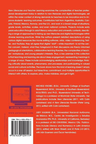 Michele Knobel (BEd, University College of Southern Queensland; MEd, University of Southern Queensland; MEd.TESOL and PhD, Queensland University of Technology) is a professor at Montclair State University. Her publications include New Literacies (2011, with Colin Lankshear) and A New Literacies Reader (Peter Lang, 2013, edited with Colin Lankshear). Judy Kalman (BA, Universidad Nacional Autónoma de México; M.S., Centro de Investigación y Estudios Avanzados-IPN; PhD, University of California, Berkeley) is a professor at DIE-CINVESTAV, Mexico City. Publications include Literacy and Numeracy in Latin America (2013, edited with Brian Street) and El Profe 2.0 (2013, with Irán Guerrero and Óscar Hernández).