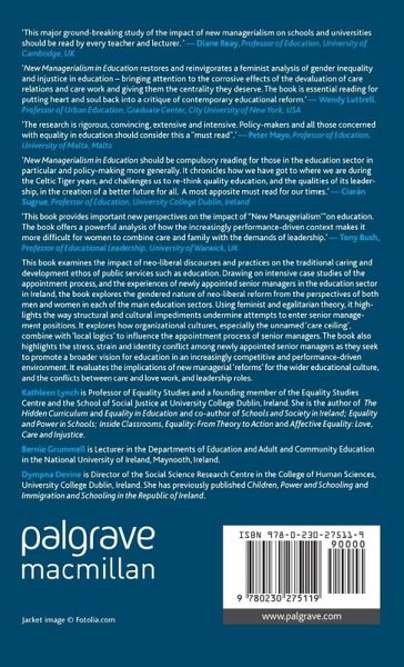 'This major ground-breaking study of the impact of new managerialism on schools and universities should be read by every teacher and lecturer. It reflexively and insightfully analyses the growing neo-liberal culture within Irish education, revealing disturbing gender and care implications for contemporary leadership.' - Diane Reay, Professor of Education, University of Cambridge, UK 'New Managerialism in Education restores and reinvigorates a feminist analysis of gender inequality and injustice in education - bringing attention to the corrosive effects of the devaluation of care relations and care work and giving them the centrality they deserve. The authors go beyond analyzing the persistence of male domination in top-level positions of power in the education sector, itself a welcomed contribution. The book peels away and exposes care-less forms of education - how constant appraisal, performance and productivity measures and standards, and surveillance are antithetical to the core work of teaching and learning which pivots around socio-emotional aspects of human relations like love, care and solidarity. The book is essential reading for putting heart and soul back into a critique of contemporary educational reform.' - Wendy Luttrell, Professor of Urban Education, Graduate Center, City University of New York, USA 'Kathleen Lynch, Bernie Grummell and Dympna Devine provide an insightful qualitative study that sheds light on the gendered nature of senior appointments in education. The research is rigorous, convincing, extensive and intensive. Policy makers and all those concerned with equality in education should consider this a 'must read.' In its copious coverage and exposition of the gender bias, and other biases, of the conditions governing selection procedures and their encoded values, this book provides a timely eye-opener for policy makers in Ireland and other countries. A particular kind of managerialism, with claims to being 'fair', has been afoot for quite some time. Alarmingly, it has been touted as the 'way to go' in various countries. This study from and centred on Ireland exposes this managerialism's Neoliberal ideological and technical-rational underpinnings which can have deleterious effects on the quality of persons' lives, notably the lives of educational leaders.' - Peter Mayo, Professor of Education, University of Malta, Malta 'New Managerialism in Education should be compulsory reading for those in the education sector in particular and policy-making more generally. It chronicles how we have got to where we are during the Celtic Tiger years, and challenges to re-think quality education, and the qualities of its leadership, in the creation of a better future for all. A most apposite must read for our times.' - Ciarán Sugrue, Professor of Education, University College Dublin, Ireland 'This book provides important new perspectives on the impact of 'New Managerialism' on education. While other texts have addressed its impact on teacher professionalism, this volume extends the debate to focus on its implications for gender, specifically but not exclusively in Ireland. Their comment that men can be 'carefree', while women remain as 'default carers', is a valuable contribution to the ongoing debate about the place of women as educational leaders. They are also right to claim that 'New Managerialism' is not gender neutral and affects women more than men. The book offers a powerful analysis of how the increasingly performance-driven context makes it more difficult for women to combine care and family with the demands of leadership.' - Tony Bush Professor of Educational Leadership University of Warwick, UK