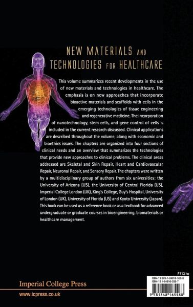 This volume summarizes recent developments in the use of new materials and technologies in healthcare. The emphasis is on new approaches that incorporate bioactive materials and scaffolds with cells in the emerging technologies of tissue engineering and regenerative medicine. The incorporation of nanotechnology, stem cells, and gene control of cells is included in the current research discussed. Clinical applications are described throughout the volume, along with economic and bioethics issues. The chapters are organized into four sections of clinical needs and an overview that summarizes the technologies that provide new approaches to clinical problems. The clinical areas addressed are Skeletal and Skin Repair, Heart and Cardiovascular Repair, Neuronal Repair, and Sensory Repair. The chapters were written by a multidisciplinary group of authors from four universities: the University of Arizona (US), the University of Central Florida (US), Imperial College London (UK) and King's College, Guy's Hospital, University of London (UK). This book can be used as a reference book or as a textbook for advanced undergraduate or graduate courses in bioengineering, biomaterials or healthcare management.