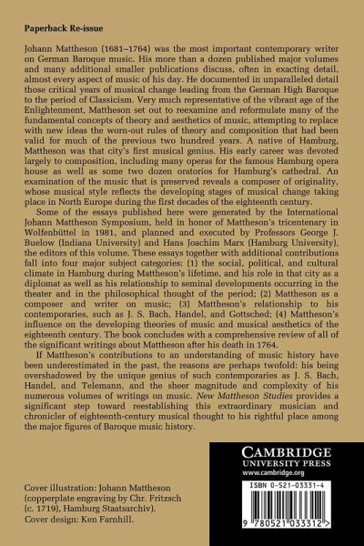 This collection of essays brings together the research on Johann Mattheson (1681(?)1;1764), an influential musician and chronicler of musical thought in eighteenth-century Germany. The essays explore the cultural climate of Hamburg during Mattheson's lifetime; Mattheson as a composer; Mattheson's relationship to his contemporaries; and Mattheson's influence on developing musical theories and aesthetics.
