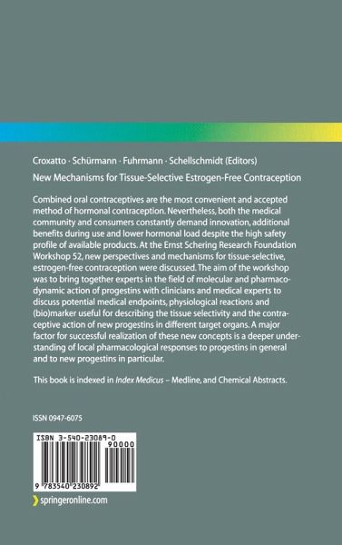 Combined oral contraceptives are the most convenient and accepted method of hormonal contraception. Nevertheless, the medical community and consumers constantly demand innovation, additional benefits during use and lower hormonal load despite the high safety profile of available products. At the Ernst Schering Research Foundation Workshop 52, new perspectives and mechanisms for tissue-selective, estrogen-free contraception were discussed. The aim of the workshop was to bring together experts in the field of molecular and pharmacodynamic action of progestins with clinicians and medical experts to discuss potential medical endpoints, physiological reactions and (bio)marker useful describing the tissue selectivity and the contraceptive action of new progestins in different target organs. A major factor for successful realization of these new concepts is a deeper understanding of local pharmacological responses to progestins in general and to new progestins in particular.