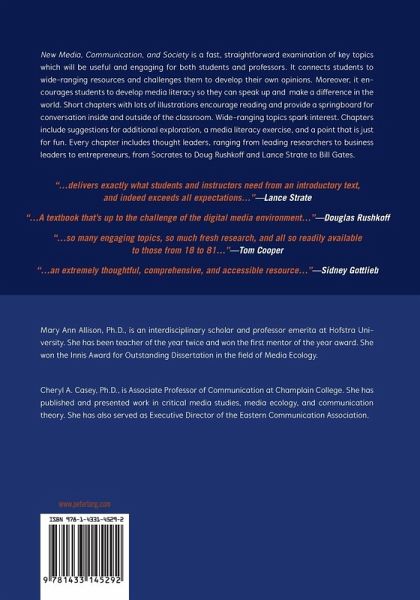 "We live in an environment characterized by extraordinary complexity, one that includes all manner of new media and digital technologies, mobile devices, wired and wireless connectivity, networks, the Internet and the web, social media, virtual reality and artificial intelligence, ubiquitous computing, cloud storage, data mining, streaming content, multi-screen viewing, information overload, participatory media, and so much more. Learning how to navigate our new media environment is no easy task, but all the more vital for anyone associated with the media professions, indeed for anyone entering the twenty-first century workplace, and ultimately for every one of us, as citizens in a democracy. There has long been a need for a text that provides a clear, accessible, and comprehensive introduction to new media, and at last, thanks to Mary Ann Allison and Cheryl A. Casey, we have one. New Media, Communication, and Society delivers exactly what students and instructors need from an introductory text, and indeed exceeds all expectations of what such a text might provide."-Lance Strate, Fordham University, author of Media Ecology: An Approach to Understanding the Human Condition